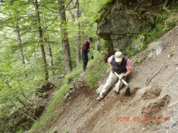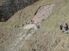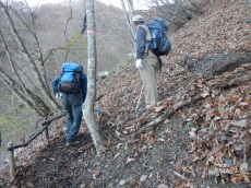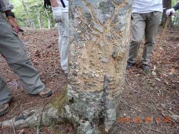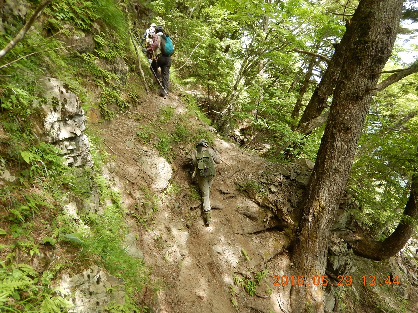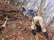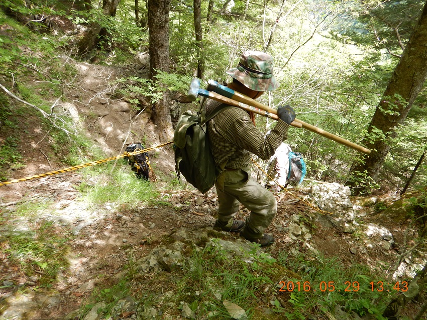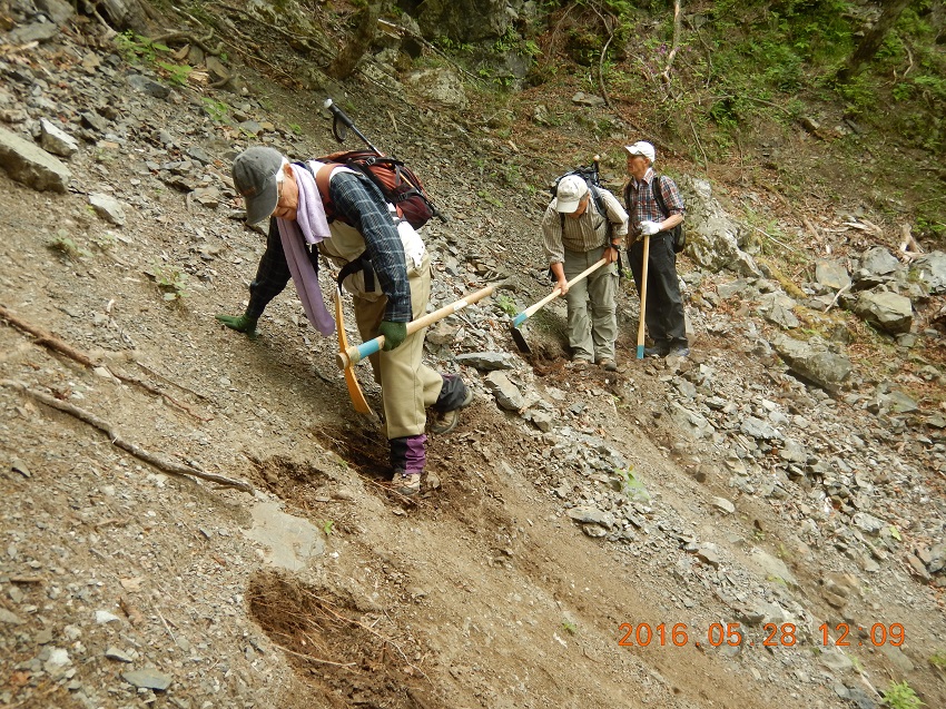 ■2018年5月26〜27日 ご報告:今年度夜叉神・高谷山・かんば平作業 小島 和人(昭和40年卒) ****** 2018年5月31日HUHACメールより転載 針葉樹会の皆様 今年度の芦安周辺の山道補修作業は10人の会員が参加して5月26日(土)、27日(日)に滞りなく実施されました。芦安ファンクラブ、地元富士通アイ・ネットワークシステムズ社の皆さんと総勢23名が集まり、芦安山の神での芦安安全祈願祭に参加した後、従来の高谷山周辺と新たに唐松岳2班に分かれて実施しました。それぞれについて岡田会員、中村(雅)会員から以下ご報告して頂きます。 小島 和人 1.高谷山周辺 (1)5月26日 メンバー;小島、本間、佐藤(久)、岡田、糟谷 担当した区域の登山道は、落ち葉に覆われていて滑りやすくなっている箇所があったが、そのような箇所は鍬を使って整地した。 桧尾峠の案内板が熊にかじられて判読できなくなっていた。早急に作り直す必要がある。 桧尾峠からは、はしご・鎖・トラロープの連続する難所が続くが、補修が必要な箇所はなかった。 (2)5月27日 メンバー;小島、本間、佐藤(久)、岡田、佐藤(活) この日は中池まで登り、中池から高谷山まで登って桧尾峠まで周回する登山道を補修整備した。トラロープ130mを持ち上げて、主として高谷山から桧尾峠へ下るルートの必要箇所に設置した。高谷山頂上の指導標は立派で明瞭であるが、降り口は伐採された太い丸太が投げ捨てられたようにおいてあり、さらに急坂が続いているため、階段つくりが必要と感じた。危険箇所のロープは張られていたが、さらに必要と思われる箇所には追加で設置した。本日のルートは、人が歩いた形跡がなかったのは残念だった。 夜叉神トンネル東口から登り始めの急登も加えて、約100mのトラロープを設置した。 ルート全体を通じて、色テープをもう少し結んで、方向の明示をする必要を感じた。 ペンキの場合、経時変化で見えにくくなる傾向がある。 岡田健志 |