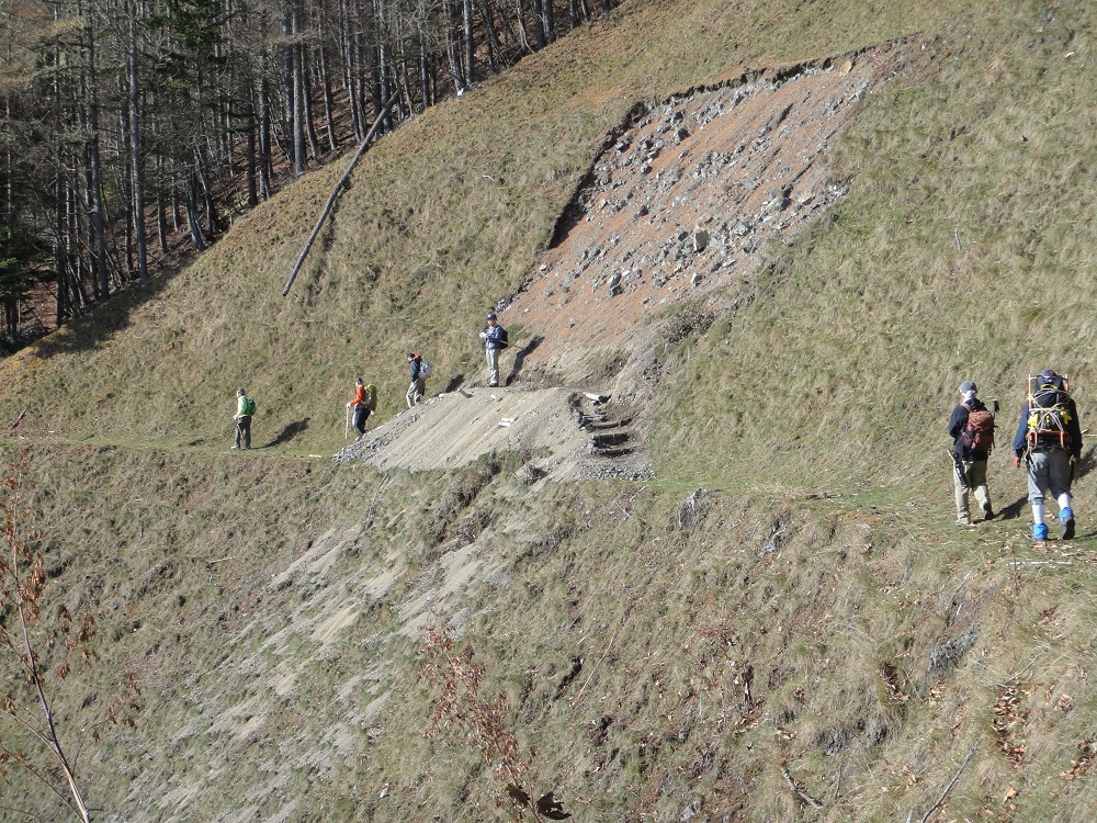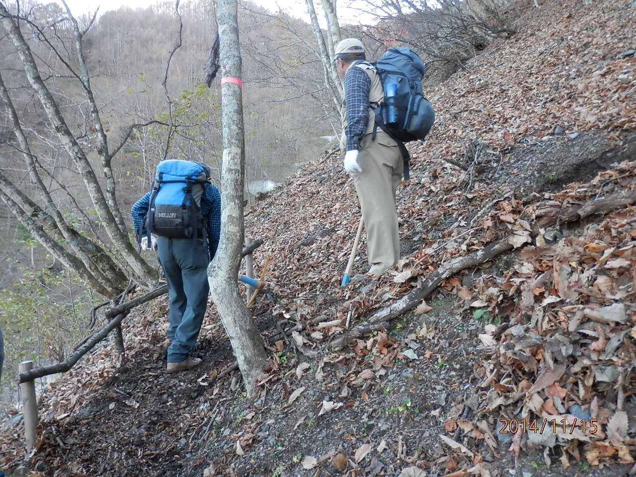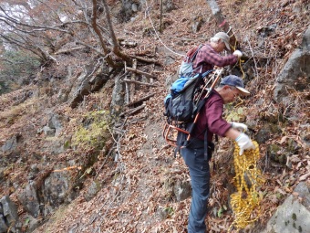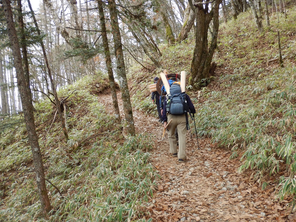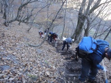 ■2014年11月15〜16日 芦安・高谷山周辺の山道修復作業報告 小島 和人(昭和40年卒) ****** 2014年11月19日HUHACメールより転載 針葉樹会の皆様 本年度の芦安・高谷山周辺の山道修復作業は予定通り実施されましたので以下概要をご報告いたします。 1.日時 平成26年11月15日(土)16日(日)の二日間。 2.参加者 15日16日の二日間で芦安ファンクラブ6名 富士通アイネットワークシステムズから15名が参加。 針葉樹会からは、上原、本間、小野、高崎(俊)、佐藤(久)、岡田、中村(雅)、宮武、小島の会員が両日参加しました。 又現役部員三年の太田貴之君が15日に参加しました。 3.作業概要 計画段階では高谷山からカンバ平への山道の修復を意図していましたが、芦安ファンクラブからの要請で以下の2か所の作業としました。 @ 一昨年修復した芦安トンネル東口から檜尾峠間の登山道上の土砂除去。昨年来の大雨により土砂崩れした部分の道及び土砂に埋まった階段などの土砂撤去を実施。 A 檜尾峠から桃ノ木温泉に下る尾根道で本年、道に迷う登山者のために救助隊が出動する事件が2度発生したとのことで、檜尾峠から同尾根道の1200m付近から分岐して芦安山の上(芦安山岳館側)に下るルートにつき、ルート設定して赤布マーキング、急斜面ロープ張、階段の設置、を実施しました。 4.その他 本年の作業により、高谷山⇒檜尾峠⇒芦安トンネル東口のルートと高谷山⇒檜尾峠⇒大骨山⇒芦安山の神(山岳館近く)ルートの二つのルートが出来まして、夜叉神峠へのハイキングも選択肢が増えました。会員のお友達との山歩きに是非ご利用ください。 尚、1200m付近から桃の木鉱泉に下る道は何ら補修がされておらず急峻なままですのでご利用は控えて頂くほうが良いと思います。詳細は新年会、会報などでご説明します。 |