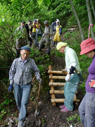 (針葉樹会&山岳部参加者) ( )内は卒年:昭和 6月16日 本間(40)、高崎(俊)(41)。齋藤(正)(42)、中村(雅)(43)、宮武(45)、佐藤(活)(53) 6月17日 本間、佐藤(久)(41)、齋藤(正)、中村(雅)、宮武、佐藤(活) [学生]小宮山(3年)、峯(3年) 6月23日 本間、小島(40)、中村(雅)、井草(48) 6月24日 小島、中村(雅)、井草 ●RE:登山道整備の報告 上原 利夫(昭33年卒) ****** 2012年7月4日HUHACメールより転載 登山道整備に参加された皆さんへ @33上原利夫です。 ご苦労様でした。PRが行き届けば、このルートを歩く登山者が増えることでしょう。公共に役立つ事業に針葉樹会が関与できたことは、まことに嬉しく思います。 クラブ活動は、本来クラブメンバーが楽しめばよいのですが、他者の喜びに貢献できるクラブもあることを、学生たちに宣伝しましょう。心ある部員が増えることを期待します。 如水会会報2012年6月号14〜19頁に一橋大学入学式の学長式辞「社会科学の精神」が掲載されています。読み応えのある内容です。新入生がどこまで理解したかわかりませんが、17頁後半に「社会科学の精神」について山内進学長の理解が示されています。些細な90周年事業も、この考え方に適合すると思います。会員の皆さんのご尽力に厚く御礼申し上げます。 【参加者コメント】投稿順 ●RE:芦安 最終版 佐藤 活朗(昭53年卒) ****** 2012年6月17日HUHACメールより転載 皆様 芦安ではお世話になりました。 きつくて楽しい?山仕事は山登りと共通するものがあると思いました。 地元の皆さまとの交流も嬉しく、機会があればまた参加させていただきたいと思います。 まずはお礼まで。 ●Re:芦安 最終版 中村 雅明(昭43年卒) ****** 2012年6月18日HUHACメールより転載 佐藤活朗さん 登山道作りお疲れ様です。 流石に小生より10才若い若手?の馬力に敬服しました。それにチェーンソーの技術を持っていて大変助かりました。井草さんと共に針葉樹会の数少ない山林技術者ですね。これからもよろしくお願いします。 皆様 初日は雨で生憎でしたが、思った以上に作業が捗り良かったですね。滑り出し上々だと思います。2日目は学生さんも二人参加してくれて大変結構でした。丸太&金棒ボッカは苦しいだけの作業ですが、階段作りは物作りの楽しさがあります。わずかな踏跡程度だった山道が2日間で見違えるほど立派な山道に変わったのを見て、満足感を覚えました。苦しいだけの作業ではないと実感できたのは大きな収穫です。引き続き頑張りましょう。 ●Re:芦安 お礼 齋藤 正(昭42年卒) ****** 2012年6月19日HUHACメールより転載 皆さんと一緒に仕事が出来て良かったです。 私は前日まで、車山で足慣らししましたので、辛いながらも何とか持ちこたえました。昨日帰宅後、じゃが薯堀りをしまして、さすがに堪えましたが、それより皆様は、ダニやぶよの被害は無かったですか?私は十数か所食われまして今もボリボリ。 来週参加する方、とりわけ本間様、身体を御労り下さい。来週行けなくてすみません。 ●Re:芦安23日・24日作業状況・仮報告 小島 和人(昭40年卒) ****** 2012年7月1日HUHACメールより転載 本間さん 16日17日は参加できず失礼しましたが、23日24日に参加できましたので私なりのコメントを以下送ります。正式報告を纏められる際の参考にしてください。