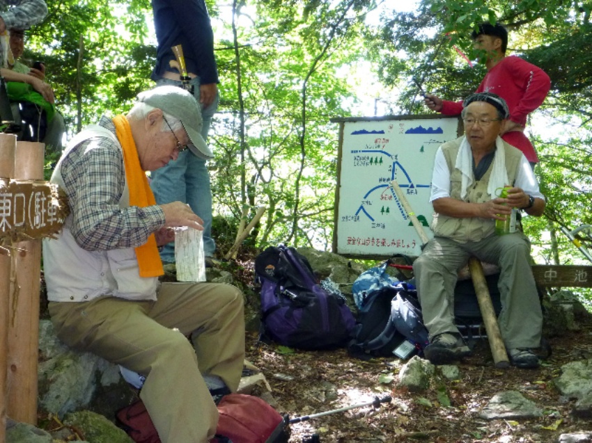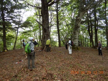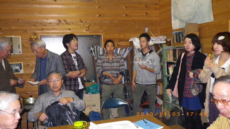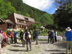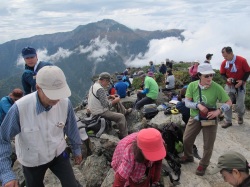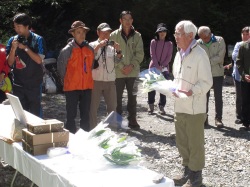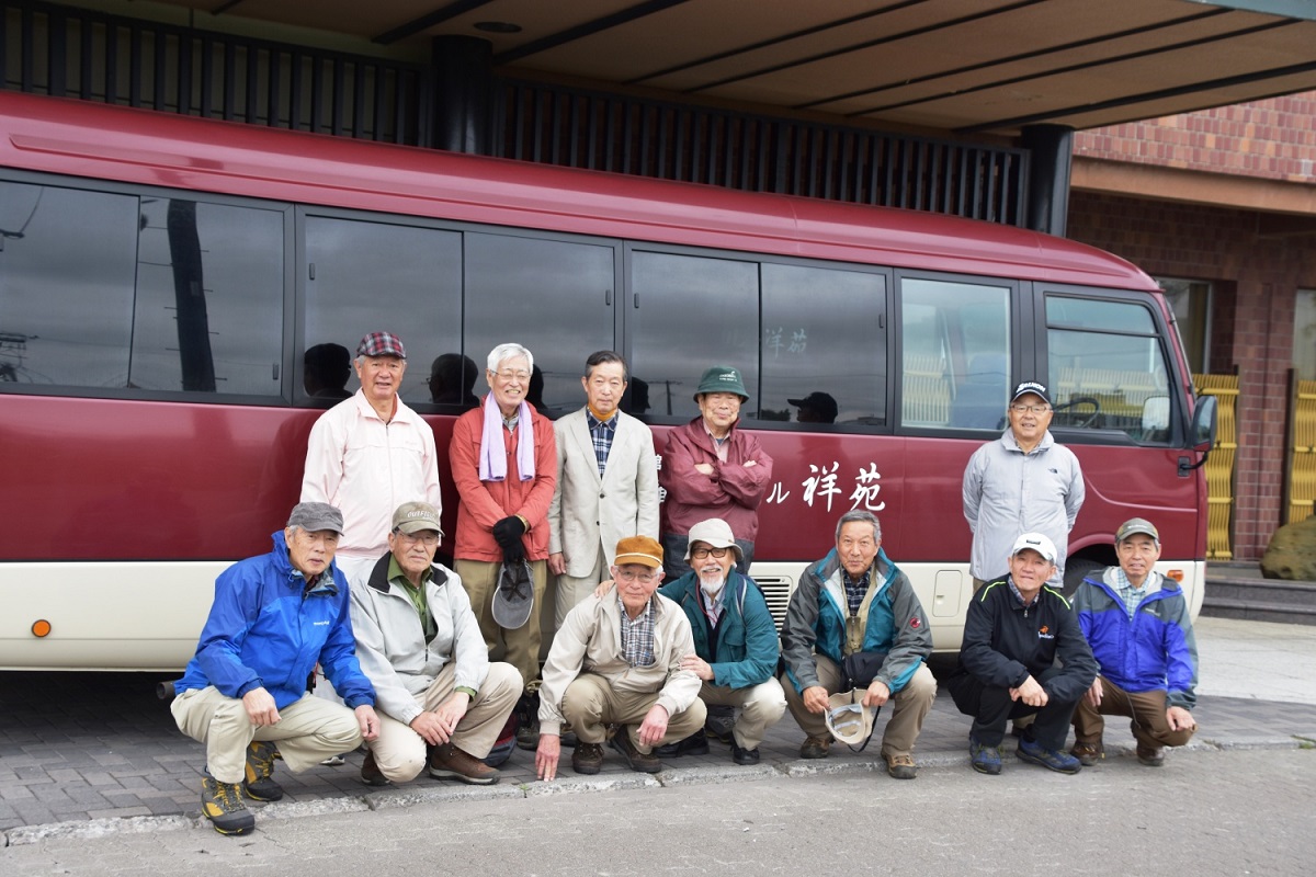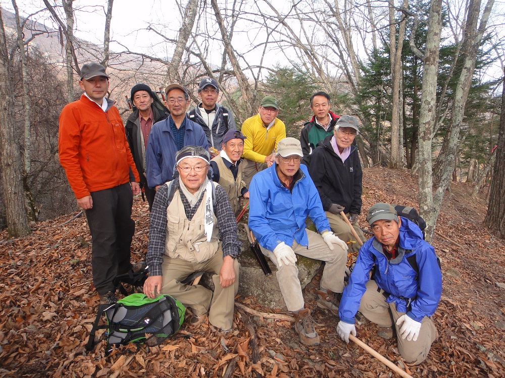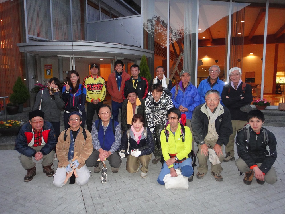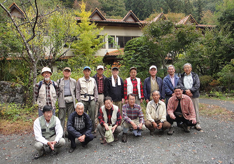 ![]() 10月27日 8:10 白雲荘を脊にして勢揃い (後列左から)蛭川、竹中、宮本、佐藤、本間、上原、坂井、高崎、小島 (前列左から)半場、遠藤、小野、三井、中村、仲田 |