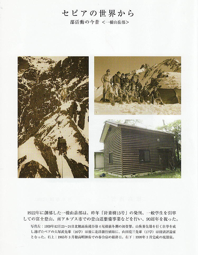 ■2013年4月 『如水会々報』2013年4月号の「セピアの世界から」に一橋山岳部の記事が掲載されました。 ●『三月会報告』2013年3月18日開催より抜粋 ▽先月も話題になりましたが、「如水会々報」では、今年「セピアの世界から」という写真1ページものの特集を組んでいます。4月号で紹介される「一橋山岳部」の写真3枚の選定に苦労しました。結局、会報編集部の意向も取り入れ、Cカンテを登る山田(亮)さんの姿を大塚さんが撮影された北穂高岳滝谷第4尾根厳冬期初登攀(昭和14年12月)の様子、新部室の外観、に加えて、昭和40年春の合宿(岳沢一周と明神東面の雪稜登攀)最終日の集合写真(S42年卒岡田さん提供)になりました。(高崎 俊平) |