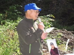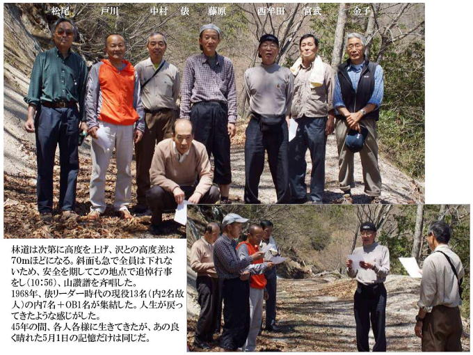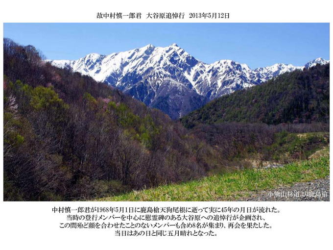 ■2013年5月12日 故中村慎一郎君の大谷原追悼行が行われました。 藤原 朋信(昭和44年卒) 金子 晴彦(昭和46年卒) ●追悼行 藤原 朋信(昭和44年卒) *********** 2013年5月26日投稿 ○企画 経緯 昨年12月、湯河原幕岩でのクライミング帰りに大船で下車して、俵と忘年会をした際、慎一郎の50回忌の話になりました。45年たった今でも気にかけている俵の思いに胸が熱くなりましたが4年後に誰がいけるのかな?との冷めた思いもありその場では話だけで終えました。 今年に入り中村さんと陽だまりハイキングの帰りに慎一郎追悼の話に及びました。 慎一郎入部時のリーダーでもある(昨年ホワイトセールで遭難した3人の追悼トレッキングにも参加した針葉樹会きっての慰霊碑訪問者でもあります)中村さんから是非やろうとの後押しがあり、また中村さんを通じて話が伝わった宮武からは、早速実施に向け打ち合わせをやろうとのメールです。どうせなら皆が元気な今年(それも5月に)に繰り上げ実施することで俵の同意も得て、当時の山岳部員で現在針葉樹会員在籍者8人に声をかけたところ、なんと全員参加との返信です。それでも1〜2人の欠席はあると予想していましたが、5月11日に全員万障繰り合わせてアダージョに集結しました。改めて一橋山岳部の結束の強さに驚かされました。 ○追悼行事 金子さんが追悼行の模様を、まとめてくれました(彼の名作の中でも白眉といって過言ではない出来です)。追悼は 花束 線香 水 を供え 全員で山讃賦を献歌しました。 心残りは慰霊碑への道が消滅して慰霊碑が見つけられなかったことです。多分慎一郎がもう一度おいでと言ってるのでしょうから、4年後の50年目に再訪して見つけたいと思います。 それにしても天気は最高、人生に一区切りついた良い追悼行でした。 . ●故中村慎一郎君 大谷原追悼行アルバム 金子 晴彦(昭和46年卒) *********** 2013年5月20日投稿 ※下の画像をクリックするとPDF版がダウンロードされます。 全15頁 写真30葉 |