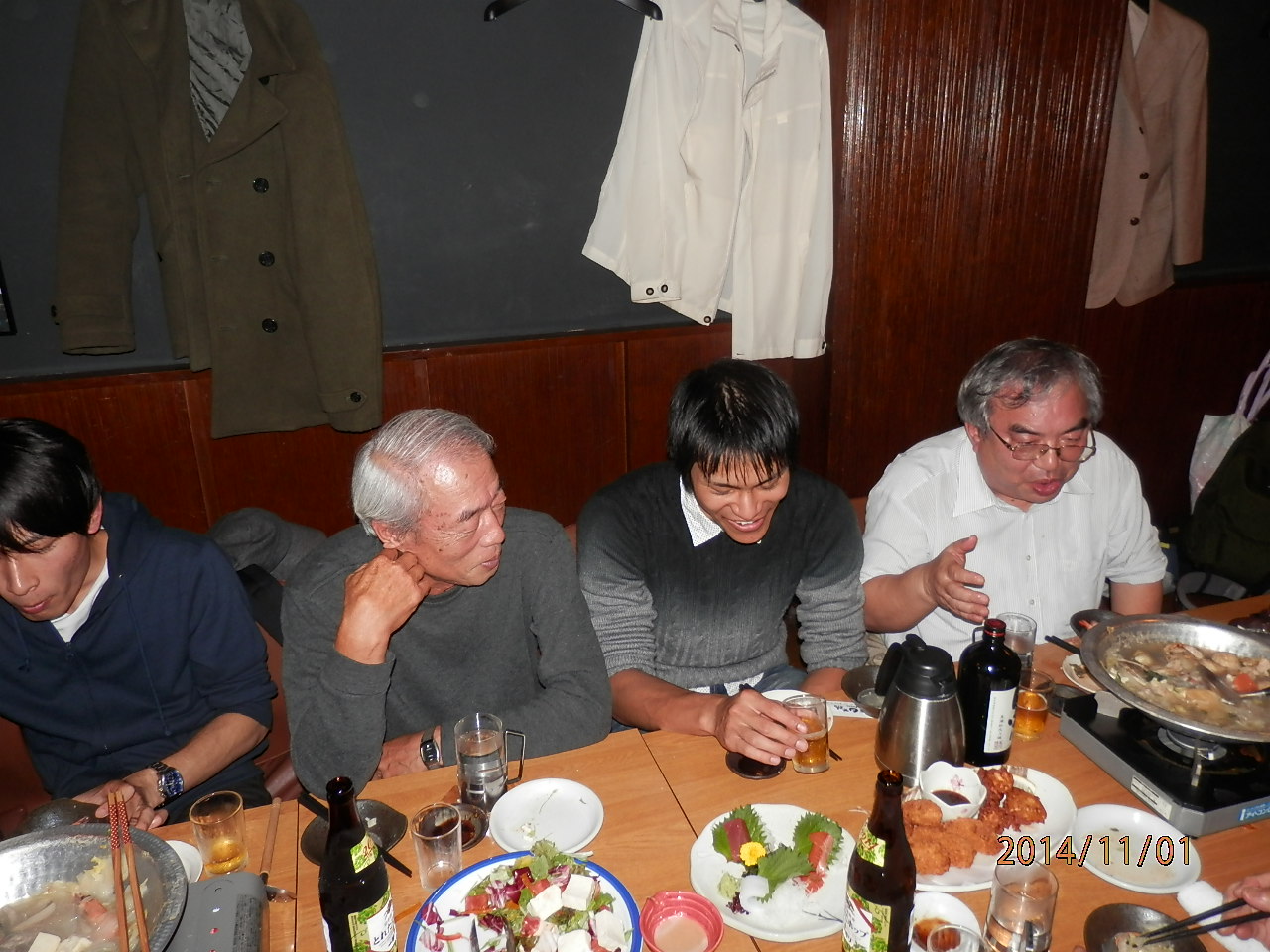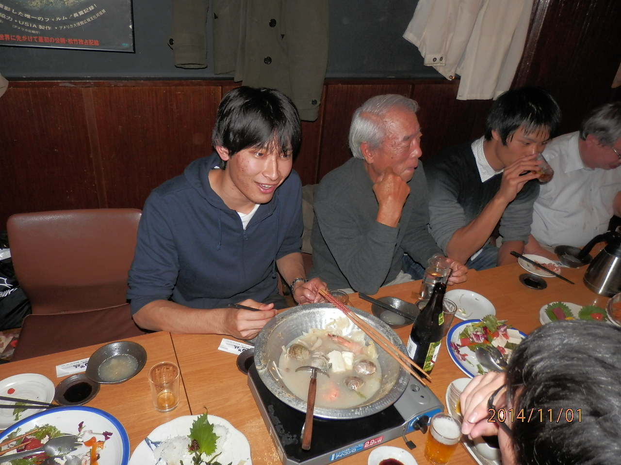 ■2015年11月1日 月見の宴の報告(「いか焼き」出店) 高橋 直道(一橋山岳部:法学部4年) ****** 2015年12月30日投稿 出席者 OB 佐藤(力)(昭40)、中村(雅)(昭43)、宮武(昭45)、前神(昭51)、長島(平15) 学生 (M1)安藤 (4年)高橋、太田、原 (3年)上、辰川、岡田、 (2年)内海、大矢、 (1年)小久保、工藤、坂本、高、胡 今年の一橋祭、山岳部はいか焼きの屋台を出店した。近年は「とり天」が続いていたところ、心機一転して新しい試みとなったことは、新入部員が多い今年の山岳部らしい点であった。2日目は平日であったことに加え、あいにくの悪天候のため集客が見込めず開店を見送ったが、1日目、3日目は売り切れとなり、予想を上回る大盛況となった。今年入部した新しいメンバーが中心となって切り盛りする姿は非常に頼もしいものであった。 月見の宴にも多くの部員が参加した。人数の多さや賑やかさは昨年度までとは大違いで非常に感慨深く、山岳部の復興に尽力した長島先輩や原さんに現在の部の様子を見てもらえたのも嬉しかった。例年と比べOBの方々と山でご一緒する機会は少なくなってきたため、このようにコミュニケーションができるのは部員にとってとても有意義だと思う。まだ部員が行っていない山の話を伺うのも非常に勉強になるし、部の現状について意見交換できるということも重要である。今後もOBと現役部員との間で盛んに交流が持たれることを願いたい。 ● 11月1日18時頃 部室での顔合わせ(撮影:中村) |
