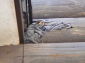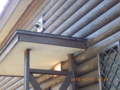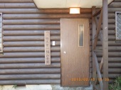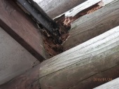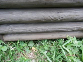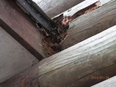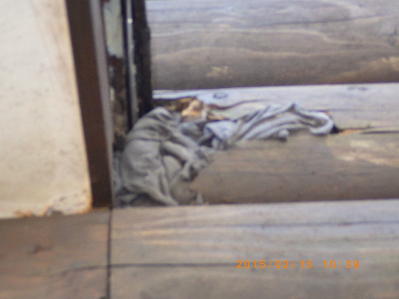 | 2.出入口ドア庇横の丸太が腐っているのを発見し、布を詰めてペンキを塗り応急修理をしましたが、 以下の完全補修をする必要があります。 1)部分補修 @庇と壁(木部)に痛み部分を少し大きめに取る。 A取った後、変性シリコーン(外部用)もしくは木製パテを埋める。 Bその後、塗装する。 2)具合によっては庇の上に水切りが必要になる。 |