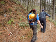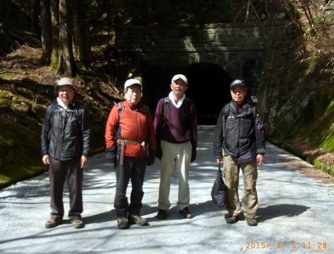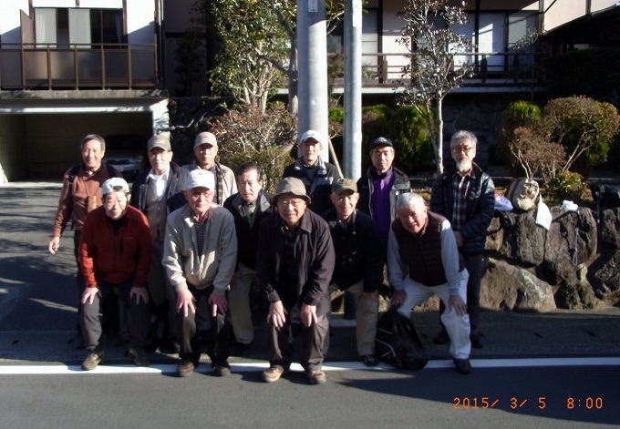 ■2015年3月4〜5日 三四郎会報告−天城越え紀行 吉沢 正(昭和42年卒) ****** 2015年4月15日投稿 筆者が入学した年(昭和38年)に在学していた山岳部員20数名で三四郎会なるOB会を作っている。同会の趣旨は専ら親睦で、年に一回程度温泉宿などに集まり勝手なことを言って酒を酌み交わし、日頃家で味わっている疎外感の憂さ晴らしをしている。時には低い山に登ったりもする。 ●3月4日(水) 第10回目の三四郎会が伊豆湯ヶ島の外れにある旅館「いろりの里三吉」にて開催された。幹事坂井さんに依ると今回は唯温泉に浸かって酒を飲んで喋り合うだけでなく、「伊豆の踊子」が通った天城旧街道の踏破も主目的の一つにしているとのことであった。 当日午後3時近く、会員12名が各地から修善寺駅に集合しタクシーで宿に向かった。遠方組には札幌から飛んで来た蛭川、小野の両氏と浜松から車を運転して来た半場氏がいる。宿は幹事が厳選しただけあって、決して四つ、五つ星のレベルではないが小奇麗で、もてなしの心が行き届いている。また小さいけれども露天風呂もある。一風呂浴びて指定された部屋に戻ると、先に着いた者達が既にビールを開けて小集会が始まっていた。 6時から一階の広間で宴会開始。横に並べた座卓に12人が適宜座を占めたが、座長格の蛭川さんを始め座椅子や短脚付きの椅子を求める者が半数に上った。考えてみれば出席者中一番若いのが筆者で、来月71を迎える。半数の人が足腰に問題を抱えてもおかしくない年頃だ。料理は刺身やてんぷらを始め、値段の割には予想外に上等だ。酒が入って近況報告に移るとやはり健康のことが多い。佐藤(力)さんは足を痛め治療に国立の無料診療所に通っているとのこと、坂井幹事は昨年末から次々に色んな病気に罹ったと言う。明るい話は半場さんが仕事を止めてストレスが無くなったので太ったこと、また池知さんは手掛けている事業が上首尾らしく、これからも頑張りたいと明るく話していた。中村君から、45年卒の宮武君が針葉樹会総会での山讃賦の歌唱音頭取りを辞退したいと言っており、佐藤(力)さんに代わってもらってはどうかと提案があった。これに対し本人から宮武君の次回三四郎会参加を条件に同意するとの表明があった。満場拍手喝采。 二次会は一階の奥の囲炉裏のある場所に移った。囲炉裏にはシシ鍋がかかっており、これを突っつきながら酒宴が続いた。シシ鍋は筆者は初めての経験だが、なかなかに味わい深いものだ。確かお碗に四杯お代わりした。ここでは皆専らシシ鍋と酒に集中し、余り突飛な話は出なかった。誰からとなく次回の幹事を誰にするかの話が出たが、ごく自然な流れとして佐藤(久)さんが指名され、本人も快諾した。次回幹事から「来年、奥多摩の御岳山の宿坊で清らかな三四郎会を開きたい」と、本気とも冗談ともつかない発言があった。誰かが「あの宿坊では酒も飲める」と返した。明日が早いので二次会も早々に切り上げ、各自部屋に戻っておとなしく床に就いたようだ。 ●3月5日(木) 今回のメインイベントである「伊豆の踊子」の通った天城旧街道の踏破のため全員7時に起床。朝食を済ませ、8時に宿を出発。各自の希望と幹事の采配により全員を以下3班に分ける。 A班:スタート地点の浄蓮の滝から大滝入口まで踊子が通った道の主要部分を踏破する健脚者コース。約20kmをひたすら愚直に歩く。メンバーは小島、小野、岡田、中村、筆者の5名。 B班:A班行程の途中水生地から大滝入口までの12kmを華麗に歩くスマートコース。メンバーは佐藤(力)、坂井、佐藤(久)、池知の4名。 C班:宿からマイカーで河津まで行き、河津桜を堪能後そのまま帰路に着くという風流コース。殆ど何も歩かない。メンバーは蛭川、半場の2名。 他に単独行の好きな原さんが、三島の鰻が忘れがたく、宿より三島に舞い戻り鰻丼を食って帰宅したらしい。 筆者にはB班、C班及び単独行班の行程の中身は分からないので、以下A班の行程について記す。 8時にタクシーで宿を出発し、20分ほどでスタート地点の浄蓮の滝に着く。まずまずの好天だが、この時期にしては風が冷たい。ザックからセーター等を出して身に着ける。まずこの滝を見ようと10分程石段を下る。すると眼下に二段、三段に亘る水量豊富な滝が水飛沫をあげている。また周囲の清水にわさび田が散在し、中々の景観だ。歩道入口の駐車場に戻りペットボトルのお茶等購入し、スタート準備を整える。ここからは天城山塊を南北に流れる木谷川に沿って国道414号線が走り、それに沿って旧下田街道が続いている。伊豆の踊子の一行と主人公の一高生が修善寺から下田まで歩いたのもこの旧下田街道だ。街道を天城峠に向かって歩き始める。道は所々トラックが通れる砂利敷きであったり、傾斜のある山道であったりする。出発地点の浄蓮の滝は標高約300mで、そこから天城峠直下の旧天城トンネルまでの標高差200m、距離8km強を登りつめて行かなければならない。途中幾つかの滝や憧憬地を