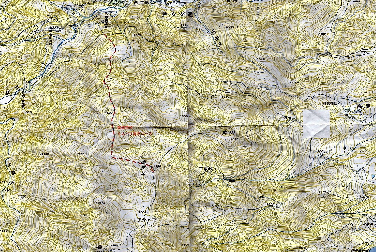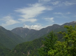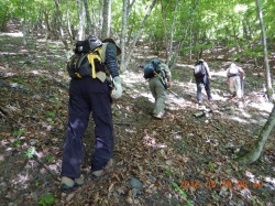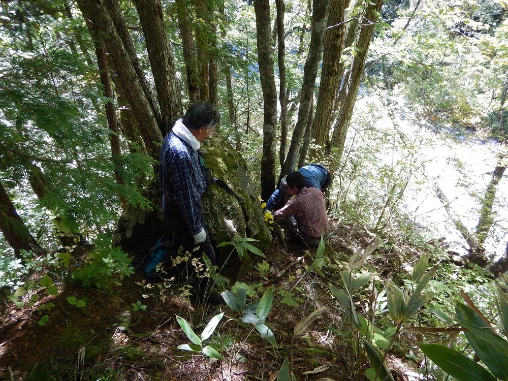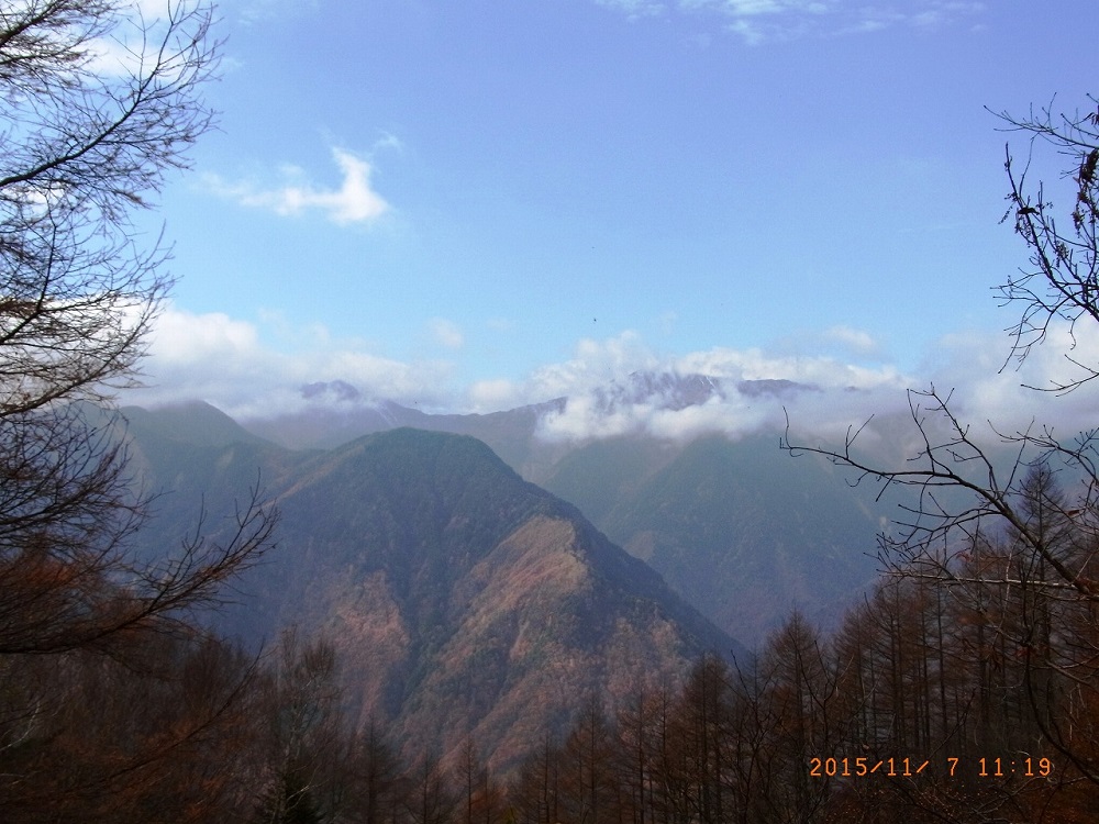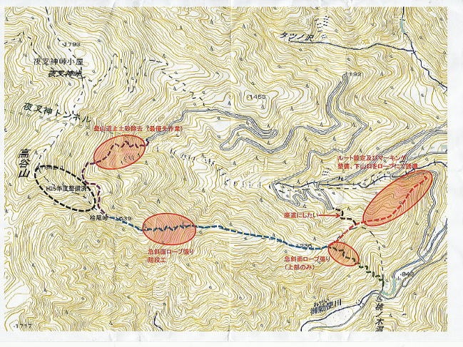 ●21日(日) 8時に芦安山岳館に佐薙・上原・本間・岡田・宮武・佐藤(周)・小島がファンクラブ5名富士通3名と合流。佐薙・本間は高谷山⇒檜尾峠⇒大骨山⇒芦安の我々が補修した尾根道の確認に夜叉神に向かう。上原さんは帰京。 岡田・宮武・佐藤(周)・小島はファンクラブ・富士通の仲間と桃の木鉱泉脇を通って車で林道を約15分遡り、それから約1時間河原を遡行、9時ドノコヤ峠登山口から峠を目指す。途中の道もかすかな踏み跡をたどる悪路であったが,1500mを越えてから山道の崩落でドノコヤ峠には到達できず、峠より高谷山よりに、道なき急斜面を直登し、清水氏が「鉄索の頭」と名付けた1683mのピークに辿り着いた時は12時20分。昼食をとって昨日の作業の団子沢山方面を眺めて確認し、下山にかかる。下山も道なき急斜面を下り難儀して2時間で登山口に帰った。河原を歩き午後3時過ぎ、止めてあった車に辿りついた時は全員疲労困憊であった。本日のルート探索は、櫛形山⇒高谷山⇒夜叉神の「南アルプスフロントトレイル」との繋ぎを目指したものだが前途は多難である。 一方、佐薙・本間の両氏もかなりのアルバイトとなって、@高谷山からの下りはじめの伐採木材の積み重ね、A稜線から山の神に分岐する地点の標識の欠如で苦労された。 今後の作業については芦安側との目標の摺合せが必要の認識を持って帰京しました。 |