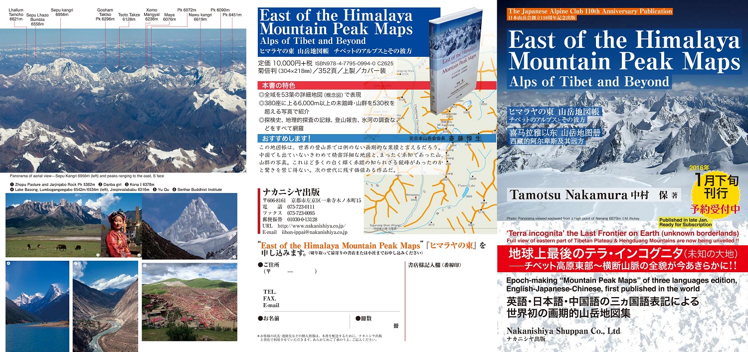 下の画像をクリックすると『ヒマラヤの東 山峰地図集』サンプルをダウンロードできます。 ![]() 【添付資料】以下の資料名をクリックすると当該資料をダウンロードできます。 1.ヒマラヤの東地図集 前書との目次 2.Japanese Alpine News -Selection for Vol. 16 2015 ベスト・セレクションの候補10点 |