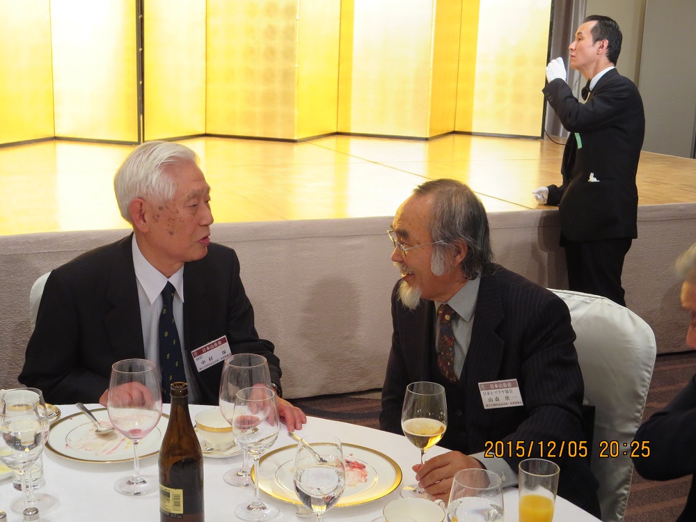 ■2015年12月5日 中村保さん(昭和33年卒)がJAC祝賀晩餐会で記念講演「禁断の南チベット2014」をされました。 ●2015年12月6日 JAC110周年・祝賀晩餐会−ヒマラヤの東地図帳 中村 保 ******2015年12月6日のHUHACメールから転載 昨日の新宿・京王プラザホテルで開催されたJAC祝賀晩餐会は110周年行事とゆうこともあって盛況(600人)でした。 竹中 彰さんご出席。 皇太子殿下に小生の記念講演「禁断の南チベット2014」にご臨席賜り、ご興味をお示し頂いたことたいへん光栄でした、祝賀会の後、別室にて今年度の秩父宮賞受賞の平出哲也君と一緒に15分ほどお話をさせて頂きました(殿下のご希望)。「ヒマラヤの東地図帳」(東海支部の「インド・ヒマラヤ」とともに記念出版)のパンフ(添付)をお持ち帰り頂きました。勿論本は進呈します。 ナカニシヤ出版さんがブースの設置・展示、パンフ配布をしてくれました。効果は充分あったと思います。 自民党の谷垣幹事長(東京大学山岳部OB、全国「山の日」協議会会長)が来賓として祝賀晩餐会に出席。元JAC会長斎藤淳生先生(京都学士山岳会)も出席されました。斎藤先生には、序文について重ねてお礼を申し上げました。装丁の小泉武さんともお話の機会がありました。本の出版を待ち望んでいます。 |