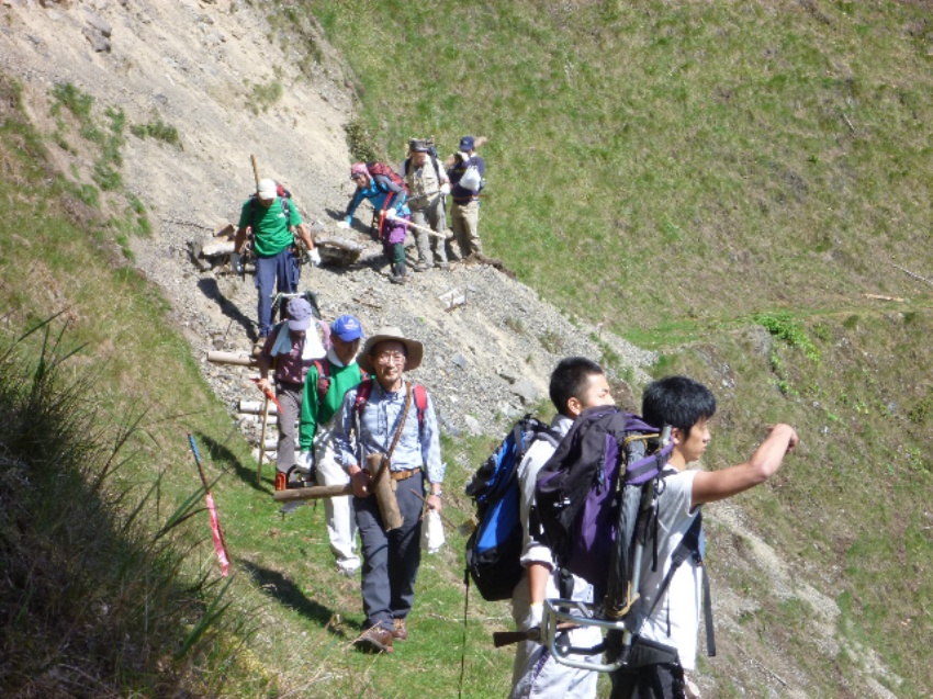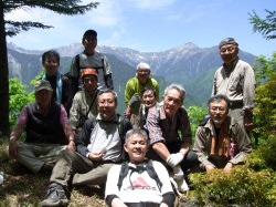 ■2016年5月28〜29日 夜叉神峠・高谷山周辺の登山道整備 小島 和人(昭和40年卒) ****** 『針葉樹会報』第136号より転載(一部改訂) 針葉樹会の皆さんは夜叉神峠の最後の短い急坂を登り小屋の前に出ると眼に飛び込んでくる白根三山の雄姿に喜び癒された経験をお持ちと思います。でも「カンバ平展望台」からの更に素晴らしいパノラマを楽しまれた方は意外に少ないのではないでしょうか? 夜叉神峠から高谷山を経て約20分、急坂を下り中池に至りますが、更に20分進むと「カンバ平展望台」に至ります。ここからは農鳥・間ノ岳・北岳の白根三山に加えてアサヨ峰、甲斐駒そして鳳凰三山まで、南アルプス北部の主峰が勢ぞろいの絶景に思わず『ほー』と声の出る大スコープの眺望が楽しめます。 創部90周年記念事業として2012年秋、まずはトンネル東口→檜尾峠の山道修復を実施しましたが、目標はカンバ平に至る道の修復でした。その後13年に檜尾峠→高谷山、14年檜尾峠→芦安大石山の神、15年高谷山→中池と、各年20人ばかりで作業を続け遂に今年、夏山シーズンを前に檜尾峠→中池→カンバ平のルートの整備が出来ました。この間、芦安ファンクラブ・地元富士通アイネットシステムの有志と一緒に作業しました。 この数年、高谷山あるいは檜尾峠から先の道が荒れていたため「カンバ平展望台」も、その先の楢や?の巨木に囲まれたおとぎの国のような「カンバ平」も敬遠されてきた様に思います。今では夜叉神登山口から夜叉神峠・高谷山・中池・カンバ平・檜尾峠を巡り登山口に帰る周回コースも安心して通れます。登山道は人が通らなければすぐ荒れます。今後も毎年補修の作業を続け100周年には立派なハイキングコースにしたいと思っていますが、会員の皆さんには是非お友達を誘ってかんば平展望台の眺望をお楽しみ頂きたいと思います。 ●作業報告 5月28日(土) 午前9時芦安山岳館集合 9時30分作業開始。芦安トンネル東口から檜尾峠に資材歩荷。 その後檜尾峠→中池間の登山道修復。16時作業終了。 芦安の白雲荘、チェッカーズに宿泊 5月29日(日) 午前8時芦安山岳館集合 8時30分作業開始。檜尾峠→中池→かんば平展望台→ カンバ平間の登山道修復と整備、檜尾峠→トンネル東口整備。15時作業終了し帰京。 ●参加者 両日参加(9名)=芦安ファンクラブ 清水准一専務理事、富士通アイ・ネットワークシステムズ(株) 岡本誠部長、 針葉樹会は佐藤久尚、岡田健志、吉沢正、中村雅明、宮武幸久、井草長雄、小島和人 第1日参加(8名)=芦安ファンクラブの大滝要造、堀内訓、井上佳之、長谷川文、 富士通アイ・ネットワークシステムズ(株)の坂上英輝、渡邉雄樹、針葉樹会は本間浩、高崎俊平 第2日参加(3名)=芦安ファンクラブの小林成正、 富士通アイ・ネットワークシステムズ(株)の高橋伸治、小平茂雄 |