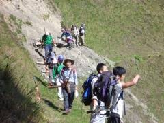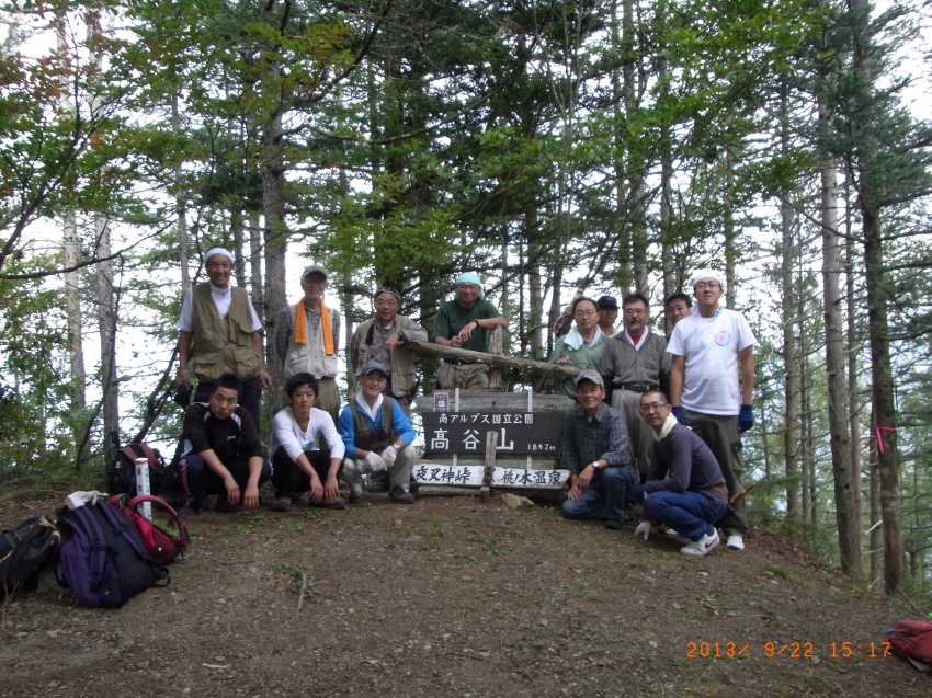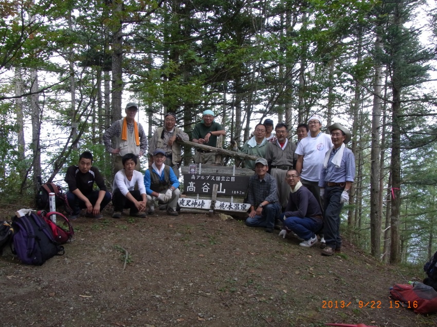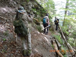■2013年9月23日 芦安での登山路整備作業のご報告 小島 和人(昭和40年卒) ******2013年9月13日 HUHACメールより転載 9月21日、22日、芦安登山道整備が予定通り実施されました。両日とも15−6名が参加して檜尾峠―高谷山間の従来からの登山道の改善に集中して作業し、昨年不評だった同区間に階段、梯子、ロープなど整備され、歩き易い登山道になりました。 これで【夜叉神登山口⇒夜叉神峠⇒高谷山⇒檜尾峠⇒芦安トンネル東口】の周回路が整備されたことになります。今回作業中にも高谷山から下山してきてトンネル東口に降りる登山者に出合いました。昨年はなかったことです。冬期にもこのルートが利用されたケースもあったと芦安ファンクラブで言っていました。 是非会員の皆様も一度誘い合わせてお出かけください。朝東京を発って甲府からバスで夜叉神登山口に向かいこの周回路を使い白根三山を中心とする南アルプスの眺望を楽しんで芦安に下山し白雲荘などで湯につかり一泊して帰るなどお仲間内の懇親に最適かと思います。夜叉神登山口⇒夜叉神峠⇒高谷山は大変整備された山道ですが、高谷山⇒檜尾峠⇒トンネル東口は山道らしい急峻さも残されていて、前半後半の変化も楽しい山歩きになります。会社のお仲間にもご紹介ください。 作業の概要は以下の通りです。 1. 参加者 一橋山岳会から、本間、小島、高崎(俊)、佐藤(力)、岡田、宮武、井草のOBと小宮山、伊藤の部員の9名が両日参加、芦安ファンクラブから21日3名22日2名、富士通アイネットワークシステムズから21日6名22日5名が参加。 2.作業 21日 午前8時半山岳館前に集合。昨年の資材の残り(丸太30本が中心)と本年購入した鉄杭など総計250Kgの資材を檜尾峠に歩荷。檜尾峠のすぐ上から階段つくりなどの作業。午後3時にトンネル東口に帰るまで作業 22日 午前8時半山岳館前集合。檜尾峠に登り作業開始。この日は丸太も使い果たし、ファンクラブの清水専務理事の指導で自然倒木を利用して階段を作りながら高谷山頂上をめざし、途中二つの梯子段を設置、必要箇所にロープも貼りました。この日一段落つけようと全員が頑張って頂上まで登山道が改善されたのは午後3時でした。夜叉神峠経由で下山、登山口で午後4時半に解散。 3.その他 (1)高谷山の山頂が枯れ木など取り除かれ広々しました。檜尾峠への下山口も整備されましたので、「山頂に道標を設置しよう」との提案が出ました。予算の残額を確認の上、ファンクラブと相談して具体化を図ります。 (2)この10か月体調不良であった本間会員が厳しい節制に耐え見事山歩き可能に回復されました。白雲荘で快気祝をしました。 (3)今回現役3年の伊藤君が初めて参加され大変強い体力を披露しました。頼もしい限りです。10月18日のOBとの合同懇親山行に参加するそうです。小宮山リーダーが熱心に指導しています。今後に期待しましょう。 以上報告 小島 |