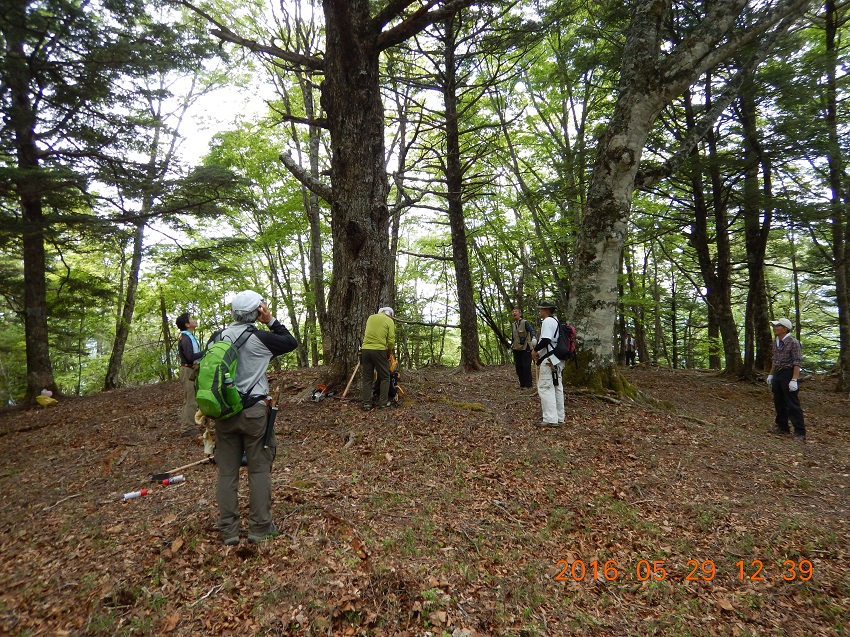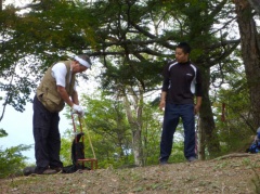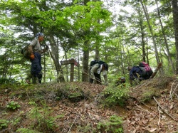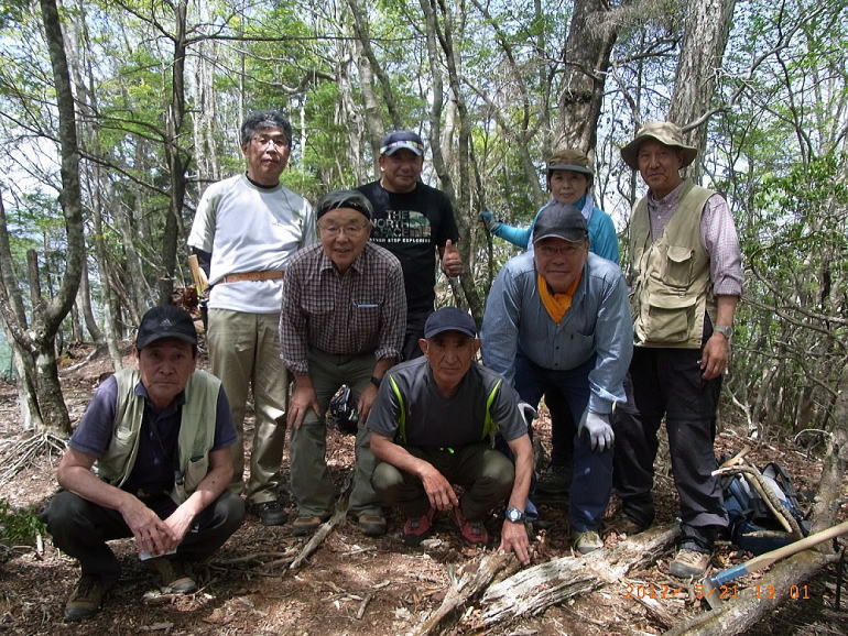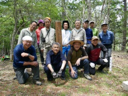 今回の作業コースは、櫛形山の北方、アヤメ平先の唐松岳(1856.4m)から芦安温泉に下るミネバリ(櫛材用の固い木質の樹木)尾根コースです。昭文社の地図では点線で荒廃と表示されています(マップ参照)。 (1)5月26日(土) [参加者]リーダー:清水准一氏 芦安ファンクラブ8名、富士通3名、針葉樹会5名(中村(雅)、井草、前神、佐藤(活)、太田) [活動] 3台の車に分乗し林道を進んで、唐松岳ミネバリ尾根コース登山口(950m)に到着。 登山口には指導標がなく知る人でないと判りません。1pで尾根上の平地(萩平)で休憩。 そこから傾斜が急になり登山道も不明瞭なのでかなり息を切らして林道(1600m位)まで登りました(休憩無し!)。 登りながらテープ、スプレーで道順印をつけました。 林道で昼食(13:30〜14:00)後、登って来たルートを下りながら消えかけていた登山道を復活(整備)しました。 道をふさぐ倒木をチェンソーで切り、張り出した枝をノコギリorナタで払います。急な斜面には鍬で階段を作ります。 道をふさぐ木の枝、落ち葉を除けます。テープ、スプレーで丹念に道印をつけました。 これらの作業の模様を富士通アイ・ネットワークシステムズの岡本氏が逐一撮影されています(翌日も)。 車を置いた林道に16時頃降り立ち、本日の作業を終了しました。 (2)5月27日(日) [参加者] リーダー:清水准一氏 芦安ファンクラブ7名、富士通3名、針葉樹会3名(中村(雅)、井草、前神) [活動] 今日は昨日車を置いた場所から20分先の丸山登山口に車を置き、丸山登山道を唐松岳まで登りました。 そこで昼食後、ミネバリ登山道を整備しながら昨日の作業終点まで下り、予定したミネバリ尾根コースの整備を完了しました。 登山口8:30〜唐松岳(昼食:11:00−40)〜(旧道整備作業)〜林道11:00−15〜(林道歩き)〜丸山登山口下15:35 ※唐松岳までの丸山登山道は緩やかな登りで明るい樹林・カラマツの新緑が綺麗な良いコースでした。 紅葉の頃に歩くのも良いでしょう。 ※唐松岳の三等三角点の前で清水さんから「三角点講義」がありました。三角点の四方一坪は国土地理院の地所である、 三角点柱石は60kg/本、淡路島産・・・など興味深い話でした。 ※今日も昨日と同様な作業を行いましたが、道は昨日より明瞭で傾斜も緩やかだったので作業が楽でした。 今日は倒れていた指導標を立て直したことが大きな作業として特筆されます。 中村雅明 |