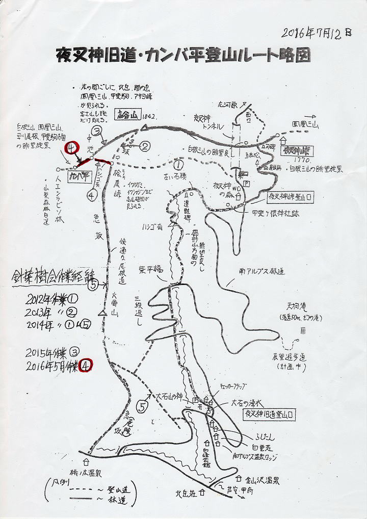 | ■2012年6月16、17、23、24日 登山道整備の報告 本間 浩(昭和40年卒) ****** 2012年7月4日HUHACメールより転載 針葉樹会員の皆様 「90周年事業」の一つ、「夜叉神峠周辺の登山道整備」の今年度作業が、地元芦安ファンクラブのご協力を得て大方終えましたので、経過をご報告いたします。