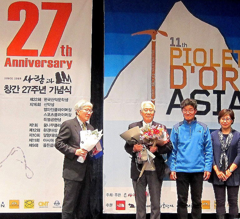 ■2016年11月4日 中村保さん(昭和33年卒)がソウルでアジア黄金のピッケル賞を受賞しました。 ●[HUHAC-GroupMail :2101] Piolets d'Or Asia Award & Autumn 2016 Plan 中村 保(昭和33年卒) ******2016年11月5日のHUHACメールから抜粋 第11回アジア黄金のピッケル賞(授賞式は11月4日)について簡単に報告します。 今回は山と渓谷社の萩原浩司さんが審査委員長を務めました。 メインイベントのアジア黄金のピッケル賞(Piolets d'Or Asia)の他に第9回Golden Climbing Award (ice climbing, free climbing, artificial climbing)と第16回Mountain Awardの授賞が行われました。スポンサーの山岳誌「人と山(Man and Mountains)」の創立27年も祝われました。 多彩なプログラムで韓国登山界の一大行事です。 約250名が出席しました。 詳しいことは省略して、アジア黄金のピッケル賞の受賞者のみを下記します。 2016 Piolets d'Or Asia Lifetime Achievements 中村 保 2016 Piolets d'Or New route on Gangapurna 7455m South Face 韓国隊(Chang-Ho, Kim他2名) 2026 Piolets d'Or 黒部ゴールデン・ピラー[剣岳] 日本隊(伊藤、佐藤、宮城) Chang-Ho, Kimは韓国最強のクライマーで、8,000m14座を全て無酸素で登頂。因みに14座を完登した韓国のクライマーは6人(うち1人は女性)。 |