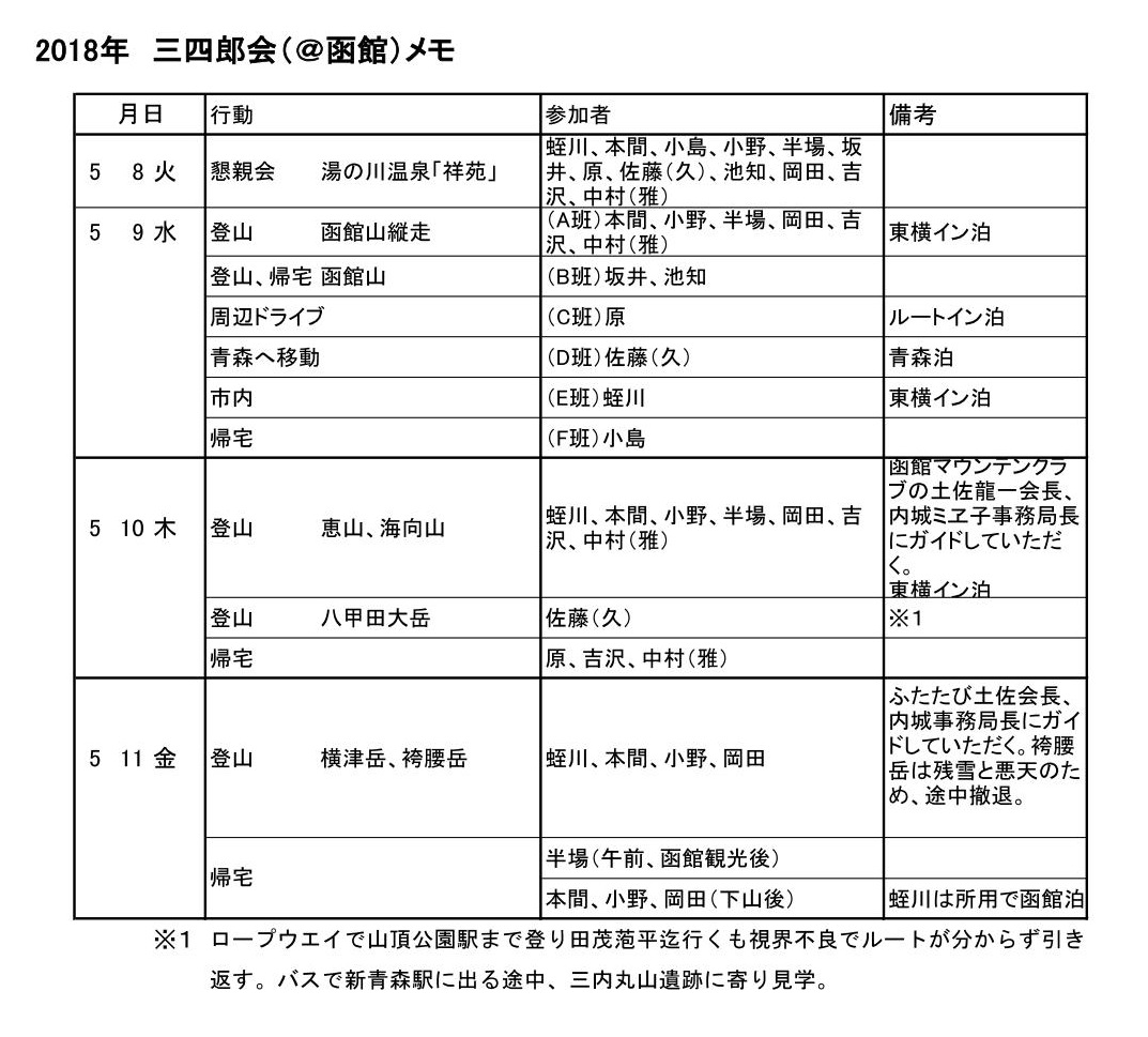 | ■2018年5月8〜11日 13回目の三四郎会が函館で開催されました。 ●2018年三四郎会の概要報告 小野 肇(昭和40年卒) 2017年6月の水上温泉での三四郎会で翌年の開催の話になり、新幹線が函館まで開業したので函館でどうだろうかとのことで札幌在住の蛭川と私が幹事となりました。 9月頃、時期と場所について皆さんの意向を集約しました。時期は5月8日、場所は函館の湯の川温泉になりました。湯の川温泉には沢山の温泉宿があり日本旅行に候補を出してもらいました。 12月に予算の関係も考慮し「湯の川観光ホテル苑」に決めて、参加人員の集約に入りました。予算15000円で1泊2食はもとより当日の懇親会は飲み放題付き、宴会個室確保などの打ち合わせを日本旅行と済ます。2次会の費用も捻出可能となりました。 年明けてから、9日のハイキングについて検討に入り、函館山ハイキングコース(帰りはロープウェイ使用も可)、函館山縦走コース、観光コースと3つの案を作り参加予定者の意向を聞きました。北海道にはなかなか来られないので延長戦を希望する方もおり、10日は恵山と海向山、11日は横津岳から烏帽子岳経由での袴腰岳往復を提示しました。 延長戦は両日ともレンタカー使用となり、運転できる方の応募があるか心配しましたが、蛭川の知人の、函館マウンテンクラブの土佐会長と内城事務局長のお二人が車の提供・運転とコースガイドとを引受けてくれました。5月2日に最終案がまとまり皆さんに連絡し、5月8日を迎えました。 参加者は12人で、本間・小島・坂井・半場・原・池知・佐藤(久)・岡田・吉沢・中村と蛭川・小野です。ホテルの送迎バスを函館駅15時30分とし、それに間に合う新幹線で本間・小島・坂井・池知・吉沢・中村が来道しました。飛行機で早めに来た岡田と私が出迎え、ホテルに8人でチェックインしました。半場・原・佐藤(久)は函館空港から、蛭川はバスで札幌からホテルにそれぞれ直行して、18時から宴会を開始できました。 翌9日はホテル前で集合写真を撮りホテルのバス8時20分発で函館駅へ。(原はレンタカーで松前方面へ、蛭川は市内観光)。 函館山は、本間・半場・坂井・池知・岡田・吉沢・中村・小野の8人。旧登山道コースで頂上へ。ここで帰京する坂井・池知と別れる。6人は、千畳敷、地蔵山、七曲がりコースをまわり、立待岬を見学し、谷地頭温泉で汗を流し、函館駅前のホテルへ。夜はこの6人に原・蛭川を入れて8人で酒宴。 5月10日は、7時30分にホテルに土佐・内城両氏に迎えに来ていただく。 参加者は本間・半場・岡田・吉沢・中村・蛭川・小野の7人。恵山と海向山登山(海向山は蛭川・半場は途中まで)。下山後、函館空港に寄り、吉沢・中村は羽田空港へ。残りは函館駅前で連泊。 5月11日は、再び土佐氏と内城氏にホテルに迎えに来ていただき、本間・岡田・蛭川・小野の4人で横津岳登山口駐車場へ。ここで函館マウンテンクラブの新人男性を加えて出発。季節外れの残雪にガスと強風に見舞われ、烏帽子岳の手前で引き返した。 新函館北斗駅から本間・岡田は東京へ。 (一部敬称略) 蛭川補記:駐車場で合流した方の名前は忘れました。今回のような外部向けのガイドをやるときは会員に案内して希望者を参加させることにしているようです。会員飛び入りの了解を内城さんから前日に求められ、どうぞどうぞと答えました。 |
