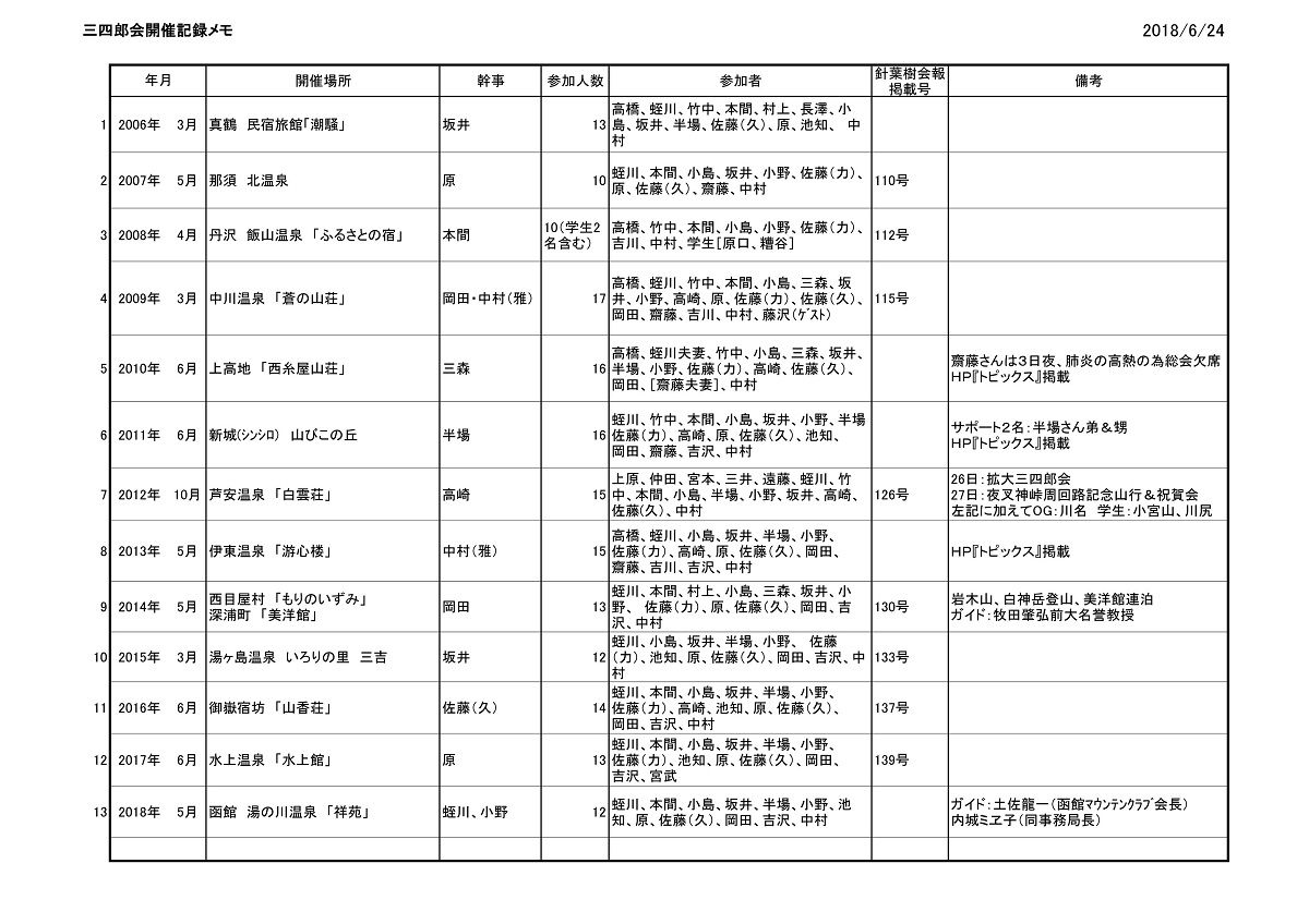 ■2013年5月24〜25日 第8回三四郎会総会が伊東温泉で行われました。 ****** 2013年6月7日投稿 1.月日;2013年5月24日(金)〜25日(土) 2.場所;伊東温泉「遊心楼」 3.参加メンバー:15名:高橋(38)、蛭川(39)、小島(40)、坂井(40)、半場(40)、小野(40)、 佐藤(力)(40)、高崎(41)、原(41)、佐藤(久)(41)、岡田(42)、齋藤(42)、吉川(42)、吉沢(42)、 中村(43:幹事) ( )内は卒年(昭和) 2006年3月4日に初めて(三四郎会の名前の由来)開催された三四郎会は今年8回目を迎えました。昨年は「夜叉神峠周辺の登山道」の初歩き会・祝賀会を兼ねて拡大三四郎会として開催されましたが、今年は従来の初日総会・宴会、二次会、翌日の登山等の延長戦の形式に戻しました。場所は交通便利な伊東温泉、延長戦は万二郎岳〜万三郎岳、伊豆城ケ崎ウォーキング、大室山(シャボテン公園)観光の3コースで参加を募りました。参加者は昨年と同じ15名。延長戦は万二郎岳〜万三郎岳の1コース6名のみでした。三四郎会も年を経るに従って顔触れが変わってきました。会の主軸年次のトーチン会(39年卒)は常連の竹中さん、本間さんが欠席、蛭川さん1人の淋しさでしたが、クレージー会(40年卒)が5名、穂橋会(41年卒)が3名、42年卒が4名と40〜42年卒が主軸の三四郎会となりました。 ●5月24日(金) 伊東駅から徒歩約15分の“遊心楼”に三々五々集合し、18:30より夕食を兼ねた総会(宴会)を始めました。幹事の中村より不参加の皆さんからのメッセージを伝え、来年の幹事は42年卒組であることを発表しました。高橋さんの乾杯の後、“海の幸満載コース”の料理(ズワイ蟹、金目、伊勢海老鬼ガラ焼き等)が一段落したところで、順番に近況報告を行いました。 登山(海外、雪の八ケ岳)、東海道歩き、親の介護、可愛い孫、新緑の宴、三四郎会の今後・・・・話題が豊富でアッと言う間に2時間が経ち、お開きの時間になりました。引き続き21時頃から21畳敷きの広い一室に移動して二次会。前半の話題の中心は蛭川さん、半場さん。ウナギ談義、イワナ釣りの極意、カジカ(河鹿蛙)とカジカ(鰍)の話で盛り上がった頃合いに、酒田出身の佐藤(力)さんから山形県の代表的民謡“庄内おばこ”が飛び出しました。その美声と岡田さんの山形訛りの歌詞の標準語解説が大受しました。後半の話題は来年の三四郎会の開催場所。来年度の幹事の一人で青森の三沢で勤務したことがある岡田さんがお馴染みの青森が浮上し、白神、八甲田、・・・と候補が上がった後、岩木山で衆議一決しました。時期は5〜6月、宿は・・・話題は尽きません。夜もふけた23:30二次会を終了しました。ここ数年、酒量が激減してきましたが、今年は話題が盛り上がった為か酒量も戻りました。来年度の遠地岩木山での開催の新機軸と相俟って心強い限りです。 ●5月25日(土) 登山組(小島、坂井、半場、佐藤(力)、岡田、中村)の出発に合わせて通常より早い7:20から朝食。朝食後、全員で記念撮影し、8:00に解散しました。登山組は8:10、2台の車に分乗し、天城高原ゴルフ場登山口に向けて出発しました。登山の模様は『国内山行報告』に掲載されています。 |
