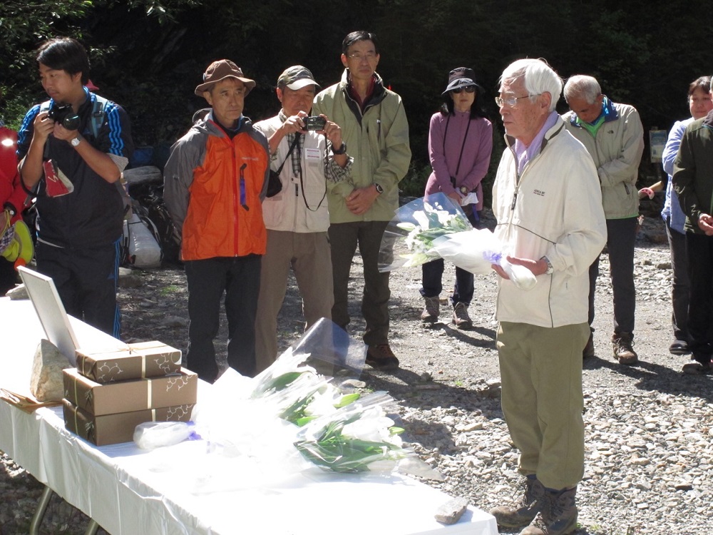 | 塩 ■塩澤久仙さんの一周忌追悼登山報告 井草長雄(昭48) ****** 2018年12月8日HUHACメールより転載 南アルプス芦安山岳館の館長として針葉樹会との縁も深かった塩澤久仙《ひさのり》さん(享年75)が栗沢山山頂で急逝されてちょうど一年目の9月24日、一周忌追悼登山がおこなわれました。針葉樹会からは本間浩、岡田健志、中村雅明、井草長雄の4名が参列しました。 朝9時半、長衛小屋のテント場に設けられた献花台前にはざっと60人ほどの参列者が集まりました。塩澤さんの後を継いで芦安ファンクラブ会長に就いた清水准一さん、塩澤さんの次男顕慈さんなどからの挨拶があり、針葉樹会からは本間浩さんが代表として献花いたしました。その後、全員が遺影に花を捧げて栗沢山を目指しました(10時30分)。 本間さんは小太郎尾根を往復して広河原小屋から。岡田さんは肩の小屋から北岳に登ったあと広河原小屋から。中村さんは甲府駅前に前泊して、井草は芦安山岳館近くの南アルプス温泉ロッジに前泊しての参加でした。 栗沢山(2714m)は、宇多田ヒカルが南アルプス天然水のテレビCMで登った山としてにわかに注目を浴びるようになった山です。清水会長らは西尾根経由(約2時間)をとり、われわれ針葉樹会員は仙水峠経由のコース(約3時間)をとりました。北岳を登ってきた岡田さんは、長衛小屋で帰る予定にしていたのを本間さんの甘言にのせられたとかで仙水峠まで登りました。本間さんも前日の疲れが出たらしく、岡田さんと一緒に仙水峠から引き返しました。 ということで、中村さんと私がなんとしてでも頂上まで行かざるをえません。トップを歩く芦安ファンクラブ副会長さんのピッチがけっこう速く、仙水峠からの急登を二人ともヒーコラいってやっと山頂についたのが12時50分頃。北岳はガスっていましたが、仙丈、甲斐駒は雲の合間から眺めることができました。 岩場に設けられた焼香台には塩澤さんの遺影、花束、ピッケルなどが供えられ登頂した全員が代わる代わる焼香しました。昼食後は流れ解散ということで我々は西尾根を下って北沢峠に向かいました。このルートもけっこう急な坂道がつづく、あまり登りには取りたくない道でした。 ともあれ無事下山、塩澤さんを偲ぶよい山行となりました。 |