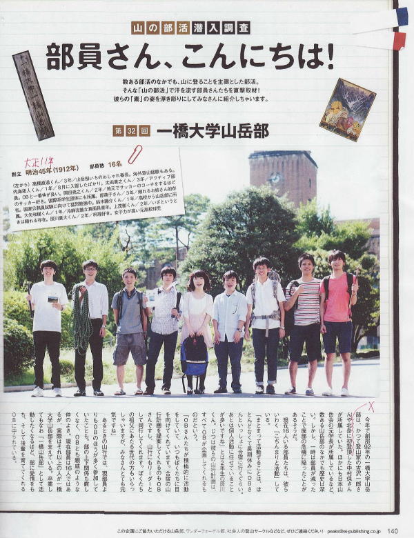 ■2014年11月15日 山岳月刊誌『PEAKS』2014年12月号に一橋山岳部の記事が掲載されました。 ●2014年11月25日 雑誌「 PEAKS 」に関するご連絡と訂正 辰川 貴大(一橋大学山岳部2年) ****** 2014年11月25日のHUHACメールから転載 針葉樹会会員の皆様 こんにちは。 一橋大学山岳部2年の辰川貴大です。 この度、一橋大学山岳部が雑誌『PEAKS』12月号の「山の部活潜入調査 部員さん、こんにちは!」に掲載されたのでご連絡いたしました。 経緯といたしましては、一橋大学山岳部のHPに編集社の方から取材の依頼を受けまして、私が窓口となり編集社の方と連絡を取り、 編集社の方に山岳部部室までお越しいただき、取材をして頂きました。 部員の紹介、部室の写真、OBさん(藤原さん)のコメントなどが掲載されています。 その雑誌の中でいくつか訂正がございます。 1)140頁 創立 明治45年(誤)大正11年(正) 2)141頁 部室が建ったのは1992年(誤)1999年(正) 3)140頁 本文(下覧)3行目 北岳に初登頂(誤) 北穂高岳滝谷グレポンに初登頂(正) 4)140頁 本文(下覧)4〜5行目 日本山岳会の元学長が所属している(誤) 日本山岳会の副会長を務めたOBがいる(正) これは校正・最終確認をした私のミスです。誠に申し訳ございませんでした。 一橋大学山岳部が一般雑誌に掲載されるのは初めてだという話を伺いました。大変面白い記事になっていると思いますので良ければ書店にてご覧になってみてください。 ●2014年11月17日開催 三月会記録 高崎 俊平(昭和41年卒) ****** 2014年11月22日のHUHACメールから抜粋 ▽山岳月刊誌「PEAKS」の最新号(12月号,11/15発売)に一橋山岳部の記事が出ています。中村(雅)さんがコピーを持参されました。記事の内容には、4カ所くらいの誤りがあるようですが、部室の中が綺麗な写真で紹介されていたり、名前入りで部員の集合写真とか肉体美を誇る部員の写真があったり、面白い記事になっています。 |
