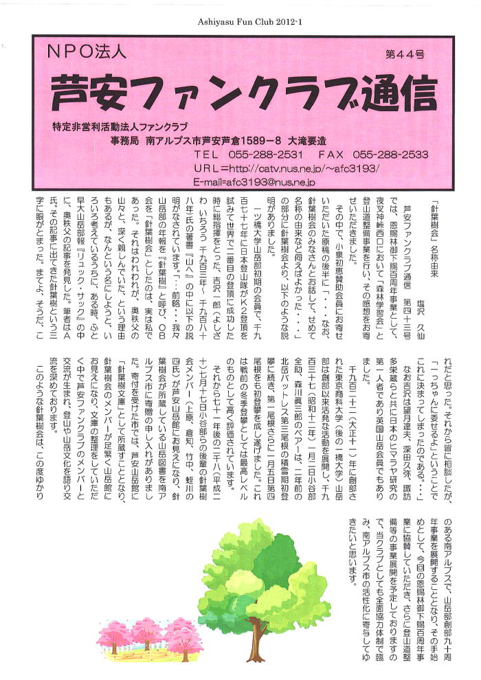 ■2012年4月 芦安との関係が深まっています。 中村 雅明(昭和43年卒) ****** 2012年4月13日投稿 3月30日の臨時総会に於いて、90周年記念事業企画が正式承認され、いよいよ実行段階に移りました。90周年記念事業の3本柱の一つ、夜叉神峠周辺の登山道整備事業の初年度は、芦安ファンクラブと共に「夜叉神峠⇒高谷山⇒檜尾峠⇒夜叉神トンネル東口登山口」(小周回路)のルートの整備を行います。その準備の為に昨年 (2011年) 1月から本間さんを中心とする推進担当が足繁く芦安に通い、芦安との交流を深めてきました。 1.今回の事業の地元受け皿になっていただくのが「芦安ファンクラブ」です。針葉樹会から既に14名(上原、小島、中村(雅)、本間、竹中、三井、遠藤、佐藤(久)、高崎(俊)、宮武、小野、半場、坂井、佐藤(力):名簿順)が遠隔地居住者対象の賛助会員になっています。 2.2011年10月22〜23日に芦安ファンクラブ主催の夜叉神峠西口登山道の整備作業に5人 (上原、本間、小島、中村、宮武:小島、中村は22日のみ)が参加しました。 参加者募集のパンフレットには「後援;針葉樹会(一ツ橋大学山岳部OB会)」が謳われ、針葉樹会を芦安ファンクラブの多くの方に知っていただきました。 3.その作業に参加した宮武さんの奮闘記が、同会の会報『芦安ファンクラブ通信』(年4回春・夏・秋・冬発行)の第43号秋に掲載されました(『針葉樹会報』第123号に転載)。 また、同号に同じ作業に参加された賛助会員の小泉初恵さんが参加報告を寄稿されましたが、その末尾に「なお、針葉樹会のみなさんとお話して、せめて名称の由来など伺えばよかった――・また機会があればよいのですが」と書いていただきました。 4.2009年5月に「南アルプス市芦安山岳館」の山岳図書コーナーの一角に、『針葉樹文庫』が開設されました。それは館長の塩沢久仙氏のご尽力の賜物でした。氏は「芦安ファンクラブ」の副会長をされていますが、「芦安ファンクラブ通信」第44号 (2012年1月) に「「針葉樹会」名称由来」を寄稿されました。「針葉樹会」の名称の由来はもとより、小谷部・森川先輩の北岳バットレスでの偉業、針葉樹文庫の開設、90周年事業としての登山道整備について懇切丁寧に紹介していただきました。以下に全文を掲載いたします。 ※このように芦安の方との人の輪がどんどん拡がっています。今後さらに交流を深め、登山道整備の成果を高める為に、「芦安ファンクラブ」への入会(年会費1000円)、整備工事への参加にご協力をお願いします。 ※「針葉樹文庫」につきましては、当ホームページの「文庫・蔵書・著作」−「文庫」をご覧下さい。 |