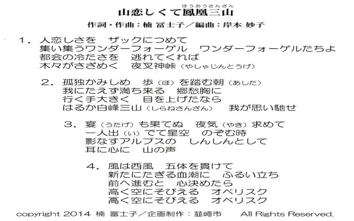 ■2014年10月12日 楽曲『山恋しくて鳳凰三山』の縁、韮崎市長から感謝状 上原 利夫(昭和33年卒) ****** 2014年10月23日投稿 先般10月12日に、韮崎市制施行60周年記念式典が、東京エレクトロン韮崎文化ホールで行われ、そのとき市長から感謝状をいただいた。その趣旨は、楽曲『山恋しくて鳳凰三山』の韮崎市への(無償)提供に尽力し、歌を通じた観光振興に寄与した、というものだった。同じく感謝状をもらった作詞作曲のF子さんと編曲のT子さんは、式典の終わりに、高らかに二重唱を歌い、大勢の参列者から万雷の拍手を得た。ようやくこれで私も任務を果たせた。 この曲は1986年秋に作られ、勤めていた会社の山の仲間で歌っていた。女子の退職で忘れられた。一昨年2012年の秋、当時よく登った15名が、山岳部長だった私を囲み旧交を温めた。25年ぶりだった。そのとき、この歌が話題になった。是非再現しよう。尾瀬の「夏の思い出」のように、今の山ガールに口ずさまれる情景を私は夢見た。これが同じ思いを持つ多くの人の気持ちに伝わり、今回の感謝状へつながった。縁は異なもの味なものである。 その一つは、企業OBペンクラブの志村さんの提案である。氏の出身地韮崎に住む実兄が音楽好きで市役所へ働きかけて下さった。市役所から即答はなかったが、フォローの風が吹いてきた。今年、南アルプスは国立公園指定50周年に当たり、ユネスコエコパークに登録された。また、韮崎市の市制施行60周年でもある。しかし何といっても、身近に本命があった。 韮崎市役所では商工観光課が楽曲関係を担当した。シンガーソングライターのまっちゃん(58歳)を起用して、ギター伴奏による、若者になじむフォークソング調の歌に仕上げた。ピアノ伴奏による二重唱との二本立てのCDを、記念式典の招待者と、市内の小・中学校に配布した。 式典当日の韮崎は、「武田の里にらさき・ふるさとまつり」で賑わっていた。JR韮崎駅南側の通りは歩行者天国になり、まっちゃんは、特設舞台でギターを抱いて『山恋しくて鳳凰三山』を歌うという。 毎年4月の第三日曜日に、日本百名山で有名な深田久弥氏を偲ぶ深田祭が、終焉の地である茅が岳麓の深田公園で行われる。『山恋しくて…』は鳳凰三山に向かいながら歌うのに相応しい。来年から深田祭の定番になるだろう。 感謝状に書かれた「観光振興」は、こうして実現してゆくのだ。 (2014.10.18記) |